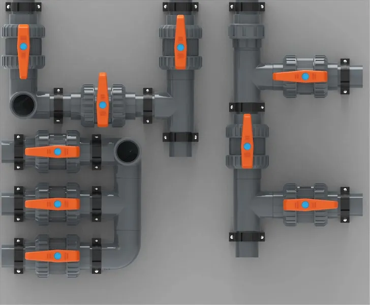 - 3 x inlaat Ø63mm met kogelkranen (skimmer/bodemdrain/bodemzuiger)